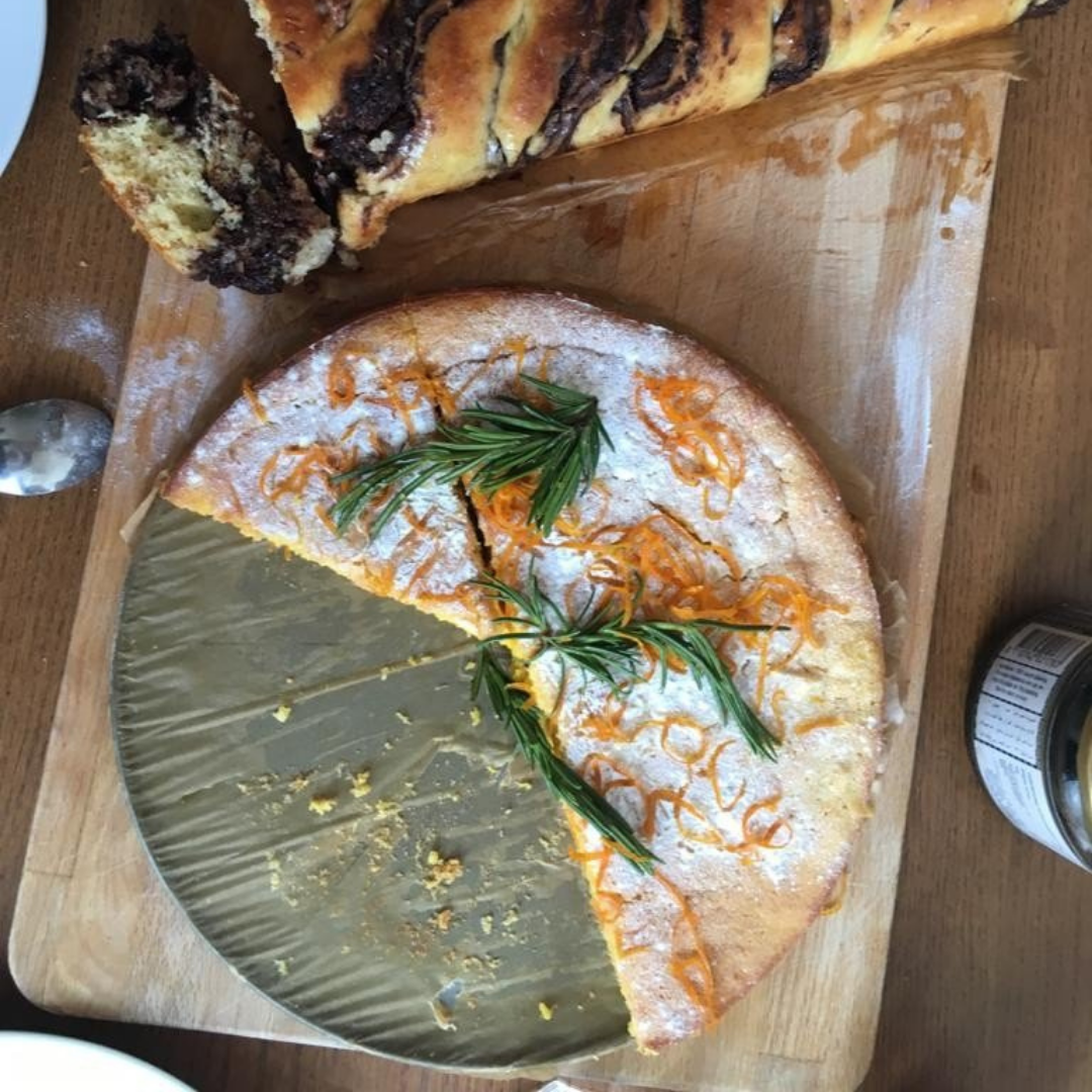 Decorate the cake by either creating a runny icing with the powdered sugar, or simply dusting the cake with it. Sprinkle on the orange peel, and serve.