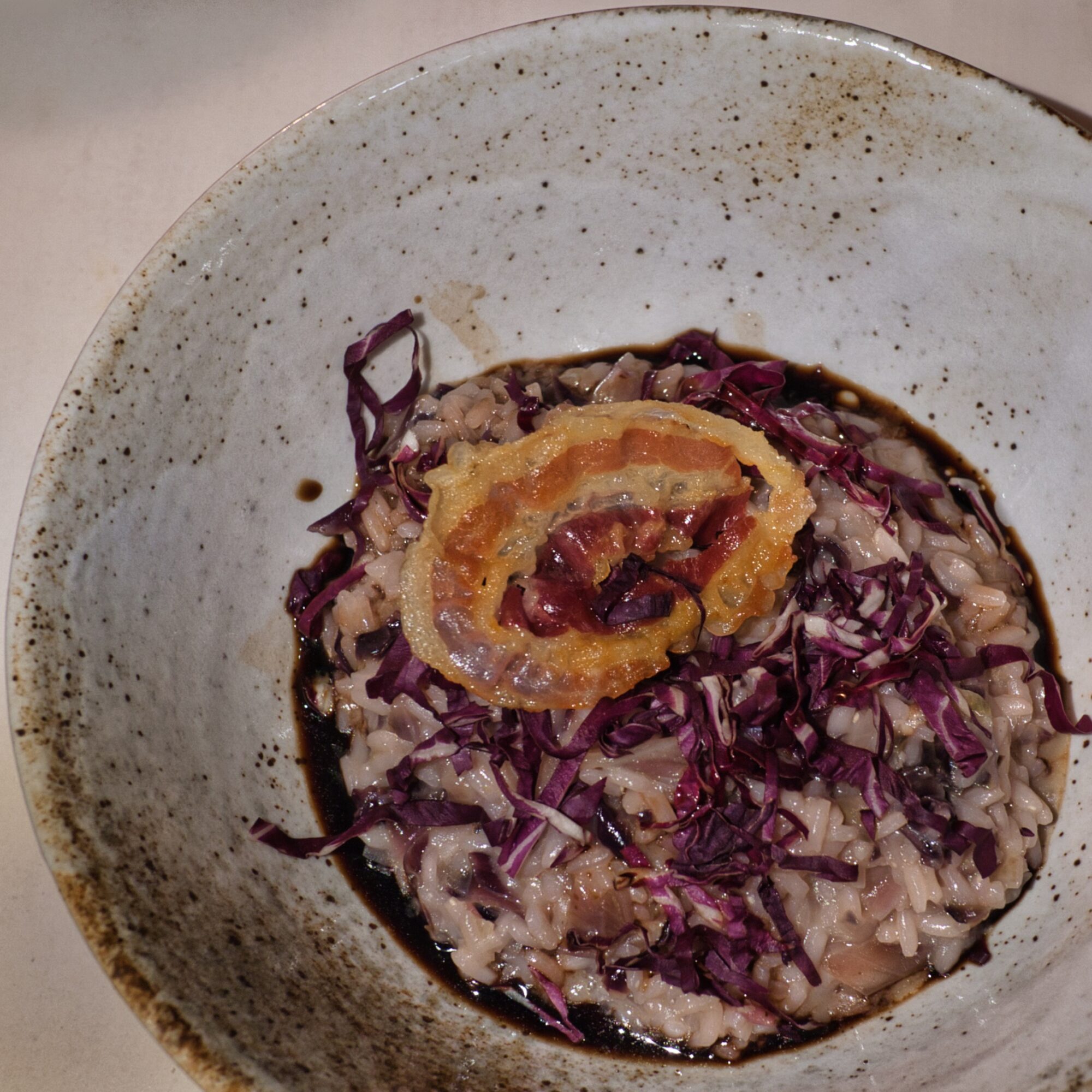 Put risotto in a bowl or on a plate. add a dash of balsamic vinegar, then sprinkle with radicchio and parmesan. place crispy pancetta slice on top and serve