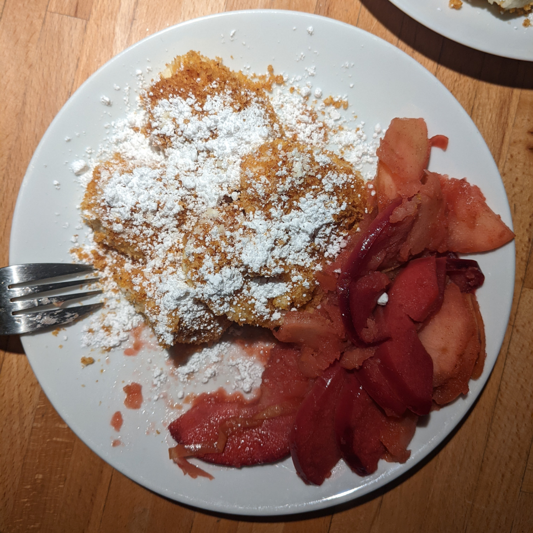 To serve, place nicely on a plate, coating in extra bread crumbs, a good dollop of some sort of fruit preserve, and dust with icing sugar.