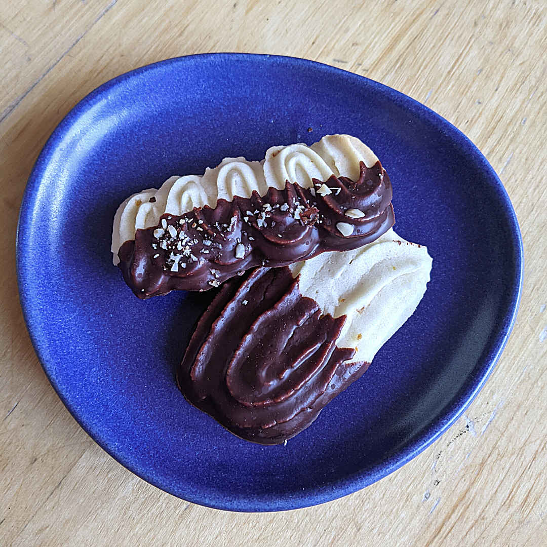 Pipe into desired shapes (piping bag + large star nose). Place in fridge/freezer to allow the butter to cool before baking.